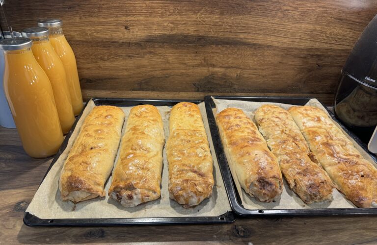 Vermengen und durchziehen lassen. Strudelteig auflegen, fülle darauf verteilen und einrollen. Oben noch mit flüssiger Butter bestreichen und ca. 30 min bei 180 grad Umluft Backen.